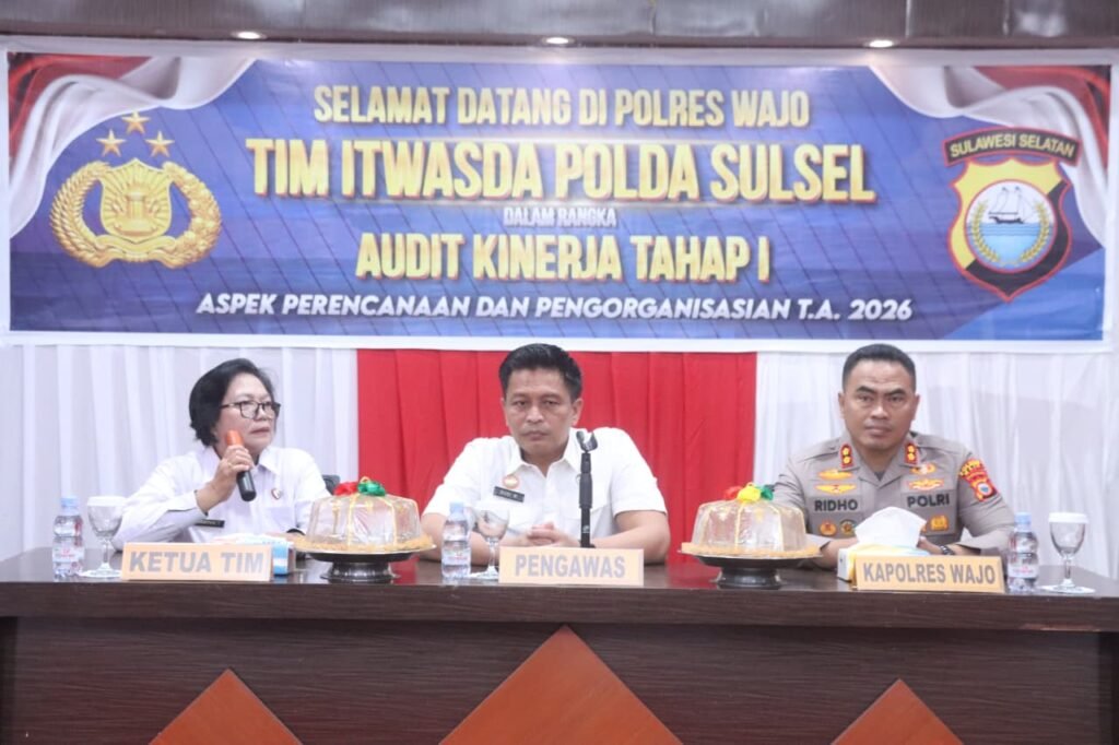 Adapun sasaran audit meliputi pemeriksaan data dan produk administrasi, dokumen, serta pertanggungjawaban keuangan yang mencakup periode Oktober 2025 hingga Maret 2026.Kapolres Wajo AKBP Muhammad Rosid Ridho menyampaikan apresiasi atas pelaksanaan audit tersebut.